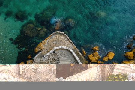 Stairs to the sea. Panoramic view from above.