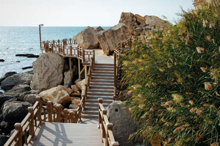 Wooden stairs leading to the sea at sunset. Beautiful seascape.