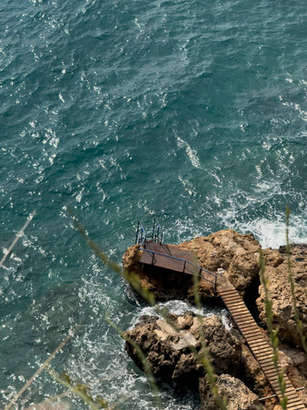 Descent into the sea from stone steps. Turquoise sea at the waterfront of the city of Paphos in Cyprus in autumn.