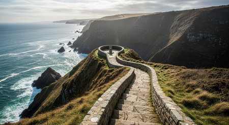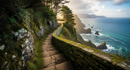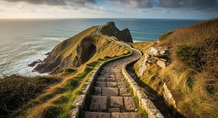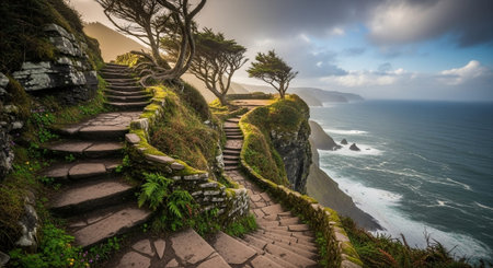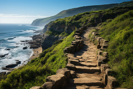 AI Generated. Coastal Path Along Rocky Cliffs Overlooking a Cove and the Sea