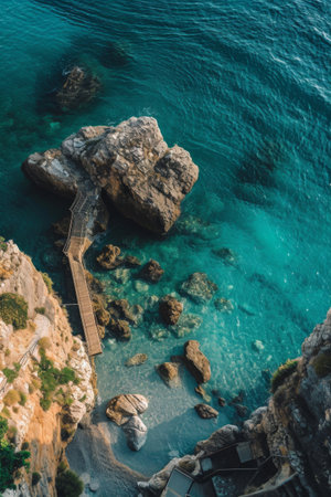 Aerial view of stone stairs descending to turquoise ocean.