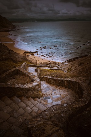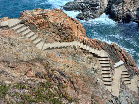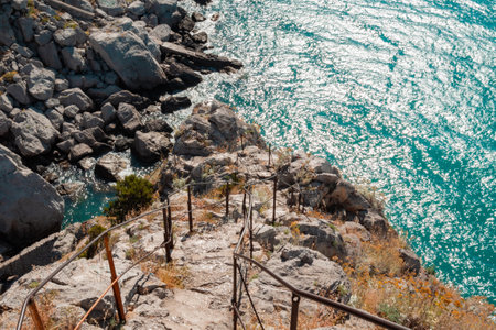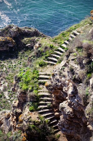 Stone stairs in rock leading down to the sea. Ancient stone steps in the rock. Stairs to the sea. Nature, cliffs and coastline landscape.