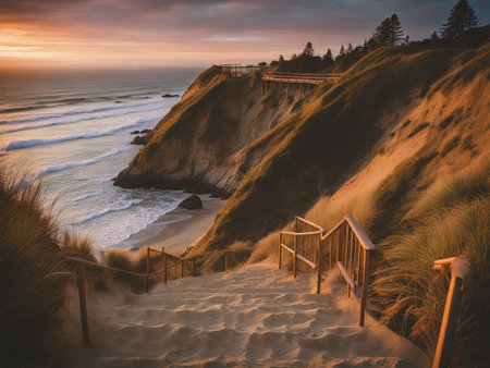 Staircase leading to the ocean at sunset, with a beautiful sky