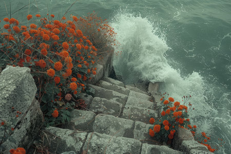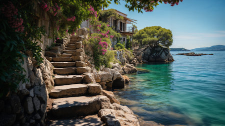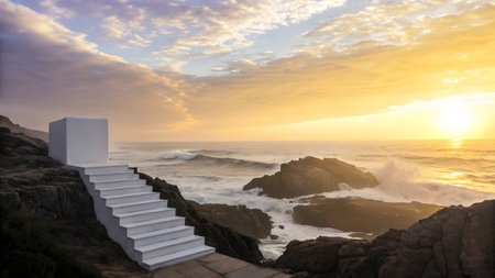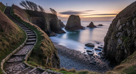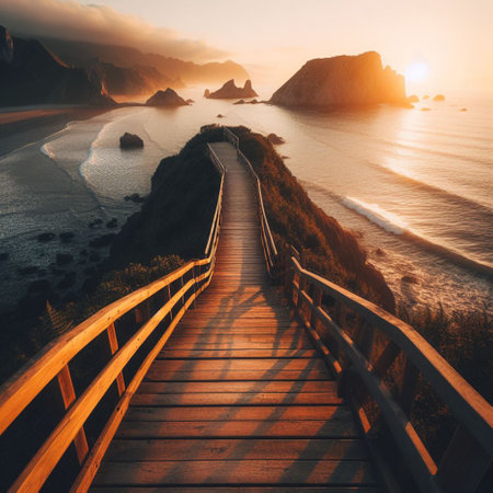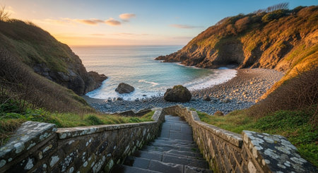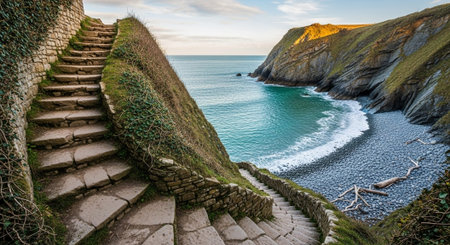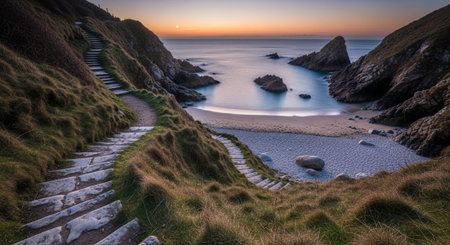 An AI generated illustration of a scenic landscape featuring a row of stone steps leading to a beach and a body of water
