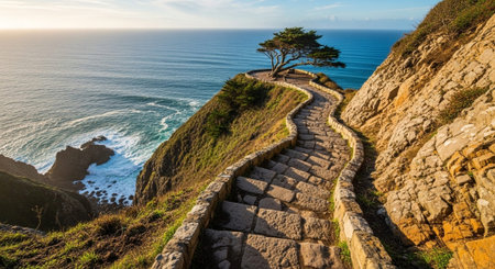 Stairway carved into cliffside overlooking vast sea and distant horizon