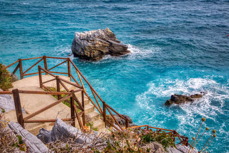The view of steep stairs and sea near Riomaggiore in the National Park of Cinque Terre, Liguria, Italy.