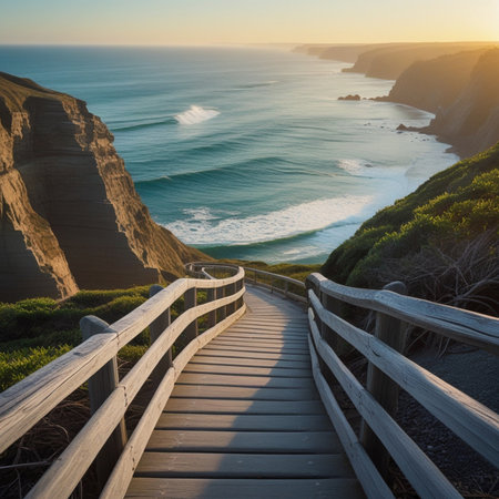 An inviting coastal scene unfolds, showcasing a wooden staircase descending onto a sandy beach. Turquoise ocean water meets the shore with gentle waves. The composition features a natural outdoor setting, suggesting a calm atmosphere. This image is suitable for various commercial uses, including travel and leisure content.