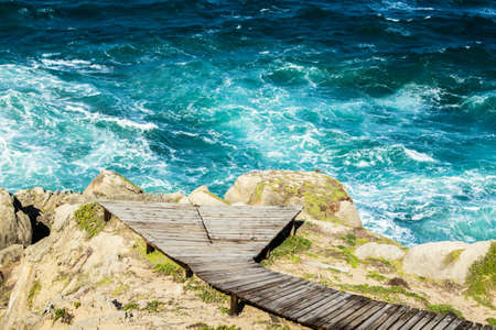 A high angle shot of a wooden pathway on the rocks over the beautiful ocean