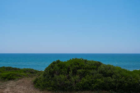 Sea landscape in soft color palette. High seashore overgrown with meadow plants and tall grass.