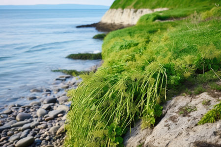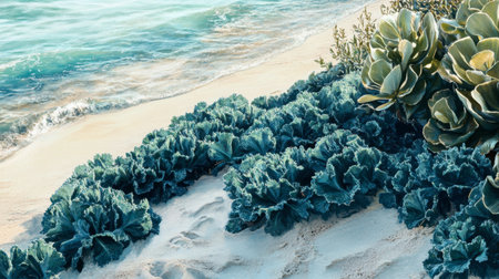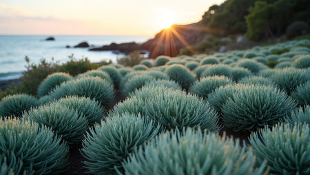 A vibrant display of coastal vegetation thriving by the ocean waves at sunset, showcasing intricate plant details and serene beach beauty.