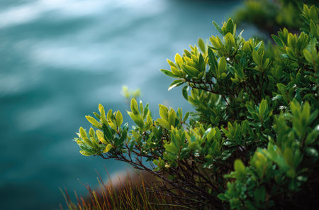 A close-up shot presents lush green leaves set against a softly blurred backdrop of blue water. The composition highlights the plant's texture and color, capturing the play of light. This image is suitable for various commercial purposes, including use in design projects or editorial content. The photograph offers a fresh and natural aesthetic.