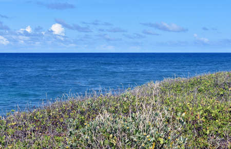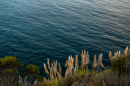 Grass flowers on the cliff. Looking down at the sea. Coastal scenery.