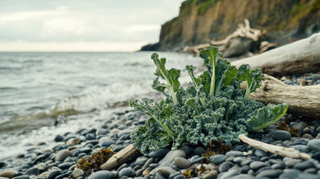 A vibrant kale plant thrives on a rocky beach, showcasing resilience against ocean waves. This scene captures the beauty of nature at the coast, emphasizing organic growth.
