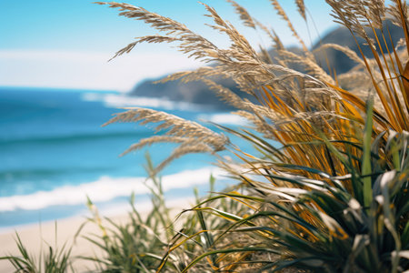 Vibrant blue foxtail grass sways gracefully in the foreground, with a stunning, blurred backdrop of the deep blue ocean and sky. This tranquil and visually striking image creates a sense of peaceful harmony between the land and sea, perfect for designs related to nature, tranquility, and coastal landscapes.