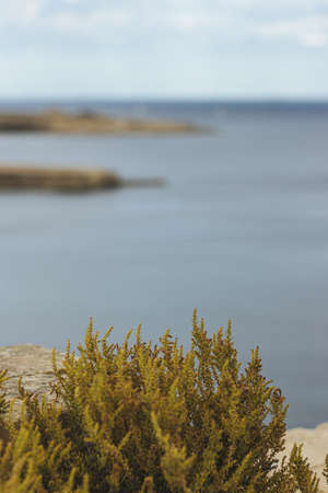 The photo shows a small green shrub growing on the beach. Not a tall plant in the foreground, but in the background the Atlantic Ocean is visible. The coastal plant grows almost in rocks.