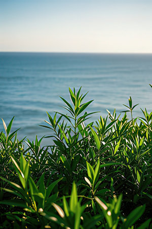 Capture the essence of tranquility with this serene beach view featuring lush green plants in the foreground and the calming ocean waves gently rolling in.