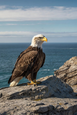 An eagle standing proudly on a rocky outcrop, with a vast ocean in the background