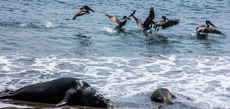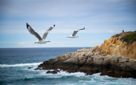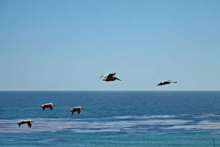 Rocky coastline and a flock of flying pelicans, turquoise colored sea and a cloudy sky in the background, California seascape