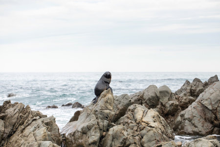 A serene scene of seals basking on a rocky shoreline, surrounded by dramatic cliffs and ocean waves, capturing the tranquility and beauty of nature.