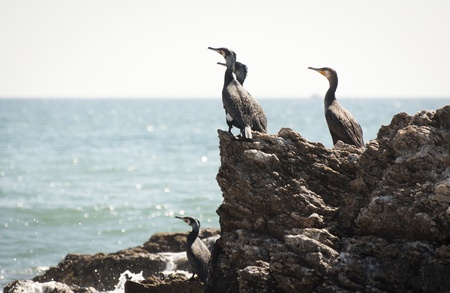 A group of Cormorants resting on a rocky shoreline in Spain.