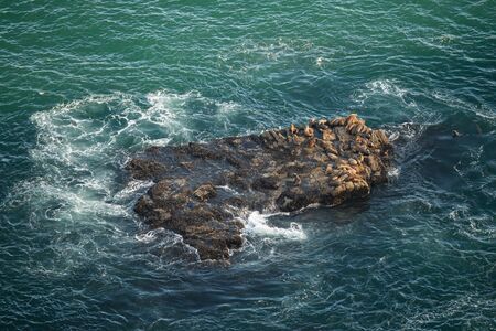 Seascape of storm morning. The colony of seals on the rocky island in the ocean. Waves breaking in spray on a stone island. Mossel bay. South Africa