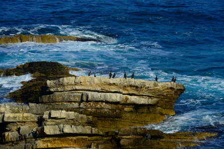 Rocks in the sea. seascape, sea waves crashing against the rocks. The sea wave crashes against the stone rock. A flock of cormorants in the sea. Agva Sardala Mr. Istanbul Turkey