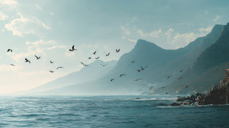 A tranquil scene of a foggy coastline where numerous birds soar above rocky outcrops, capturing the serene beauty of nature's coastal landscape.