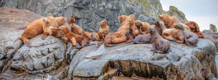 group of Sea Lions sit on a rock close to the Pacific Ocean, Kamchatka Peninsula