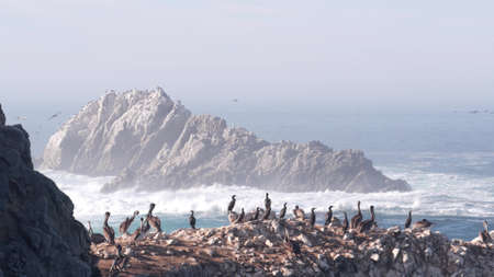 Flock of brown pelicans on cliff, rocky island in ocean, Point Lobos landscape, Monterey wildlife, California coast, USA. Big waves crashing, birds flying. Many pelecanus nesting, wild animals colony.