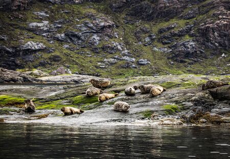 Cute Seals on the rocks of Doubtful Sound. Beautiful scenery in Fiordland National Park, South Island, New Zealand