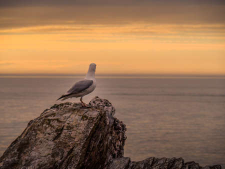 Gentle sunset with gull on rocks looking at sunset and clouds. North Devon coast.