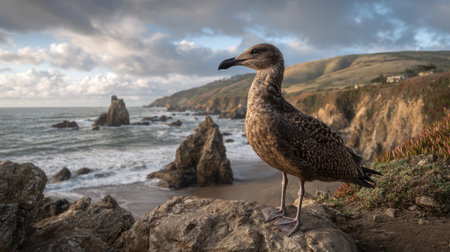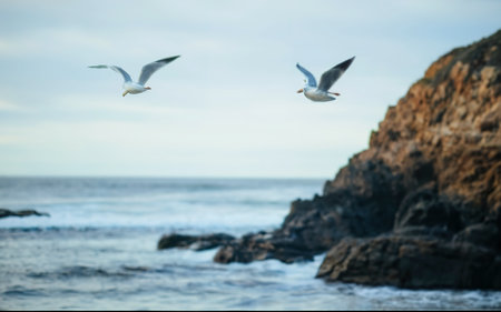 California coastline landscape. Rocky cliffs and native plants on the beach at sunset, and silhouette of flying birds with cloudy sky on background. Dramatic seascape, copy space