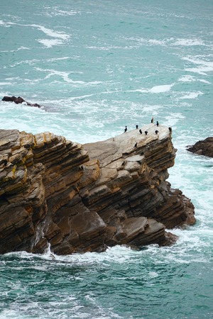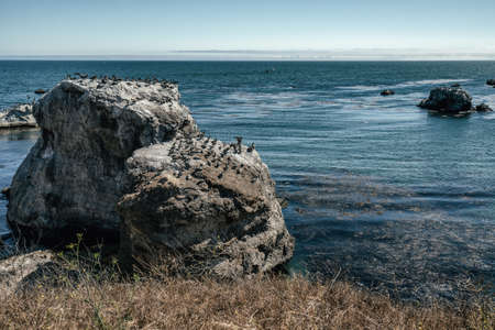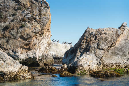 Rocky cliffs in the ocean and flock of cormorants. Pacific ocean, Los Osos, California Central Coast