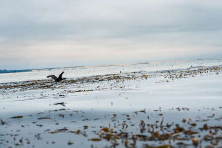 Bird colony in Paracas national park at the Pacific Ocean coast line of Peru. Guanay cormorant or Guanay shag, Leucocarbo bougainvillii, on guano covered rocks at the peruvian coast