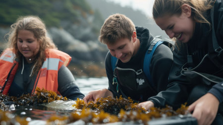 Iceland seals in the water. Relax on the seaweed. Rocks, animals in the habitat of nature Along the North Sea coast