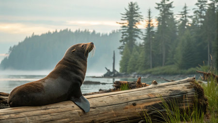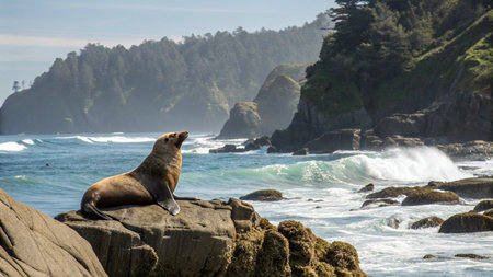 This serene image captures two seals resting on a rocky surface by the ocean, set against a misty background that enhances the tranquility of their habitat.