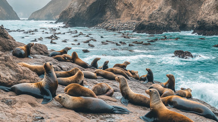 A colony of sea lions lounging on the rocky beaches of Ballestas Islands, framed by turquoise ocean waves.