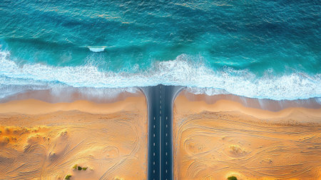 Aerial view of an empty road in the desert, with sand dunes and the sea on both sides, taken by Unsplash, from above in the style of Unsplash. --chaos 30 --ar 16:9 --quality 2 --stylize 500 --v 6.1 Job ID: 0bfd0878-33ad-4a85-934b-91bf06dda2bf