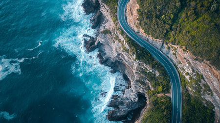 An overhead perspective reveals a coastal road flanked by a rocky shoreline and clear turquoise water. The image features a vibrant contrast between the asphalt road, green vegetation, and the varying shades of the sea. Suitable for travel, tourism, or environmental themes, this scene offers versatility.