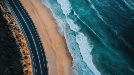 Aerial view of a coastal road running parallel to the ocean, no cars, with ample copy space