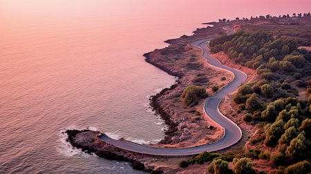 Aerial view of seascape at sunset. Composition of nature, Aerial view of a road along the sea at sunset, AI Generated