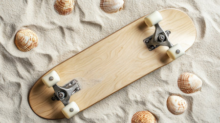 A striking skateboard resting on soft sand, accented by seashells, evokes a sense of summer adventure and beach vibes. Perfect for creative projects!