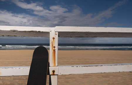 A vibrant skateboard leans against an old railing overlooking the waves of the ocean. Fluffy clouds hover above, creating a perfect backdrop for a day filled with adventure and freedom by the sea.