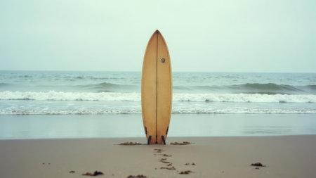 A yellow surfboard stands on a sandy beach, set against the backdrop of ocean waves and a clear blue sky. The composition features a symmetrical arrangement, with the surfboard as the central focus. The image uses natural lighting to create soft shadows, suitable for use in promotional materials or editorial content.