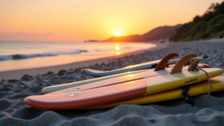 Brightly colored surfboards rest on the sandy beach as the sun sets, casting a warm glow over the scene and creating a relaxed atmosphere for surfers.