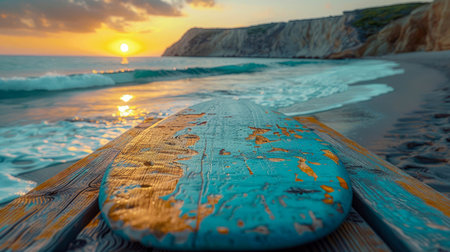 surfboard by the sea at sunset, leisure and hobbies concept, copy space for text