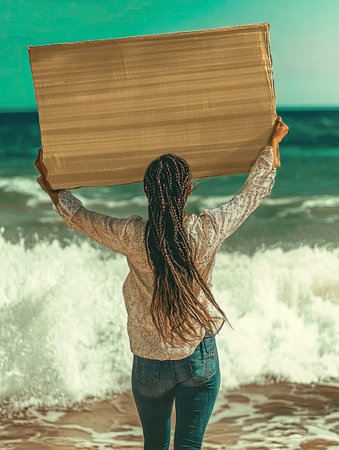 photo of a woman with long braided hair holding an empty sign, standing near a beach with waves crashing in the background, windy day --chaos 12 --ar 3:4 --weird 150 --v 6.1 Job ID: 6e51e276-d7e8-48ad-944c-f8a36d39ef12