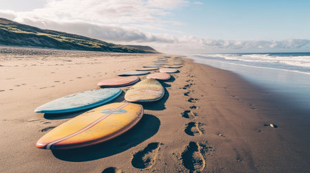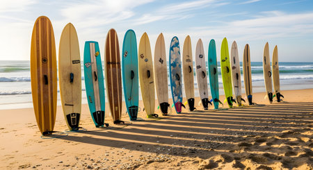 Surfboards Lined Up on a Golden Sandy Beach A row of surfboards lined up on a golden sandy beach, the ocean waves crashing