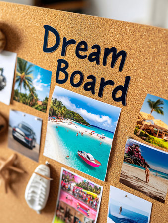 A detailed and colorful dream board featuring pinned images of beach destinations, ocean views, and tropical landscapes, symbolizing travel aspirations and lifestyle goals.