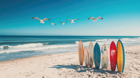 Group of surfboards propped up on a sandy beach, with seagulls flying over the water under a clear blue sky